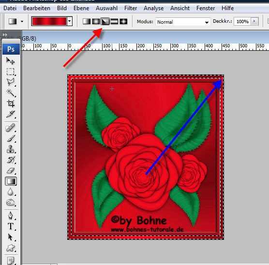 16) stell dein Verlauf von Linerare Verlauf auf Verlaufswinkel auf und ziehe den Verlauf von der Mitte zur rechten oberen Ecke auf